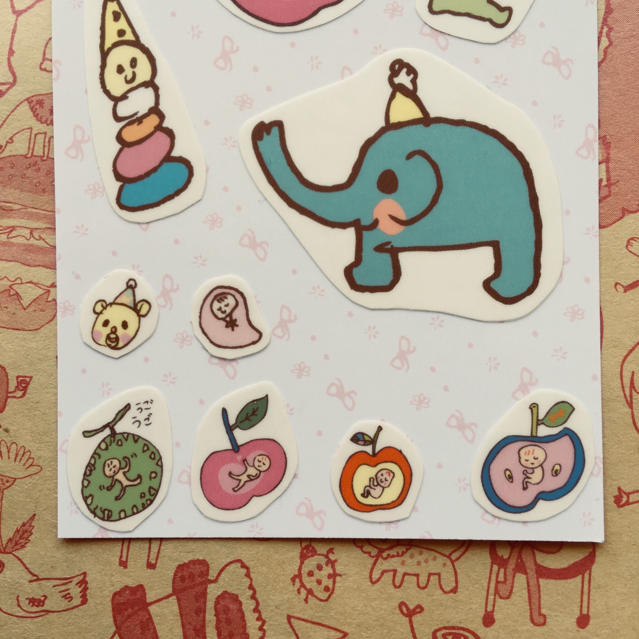 赤ん坊にまつわるイラストの透明のシールが何枚かついています。